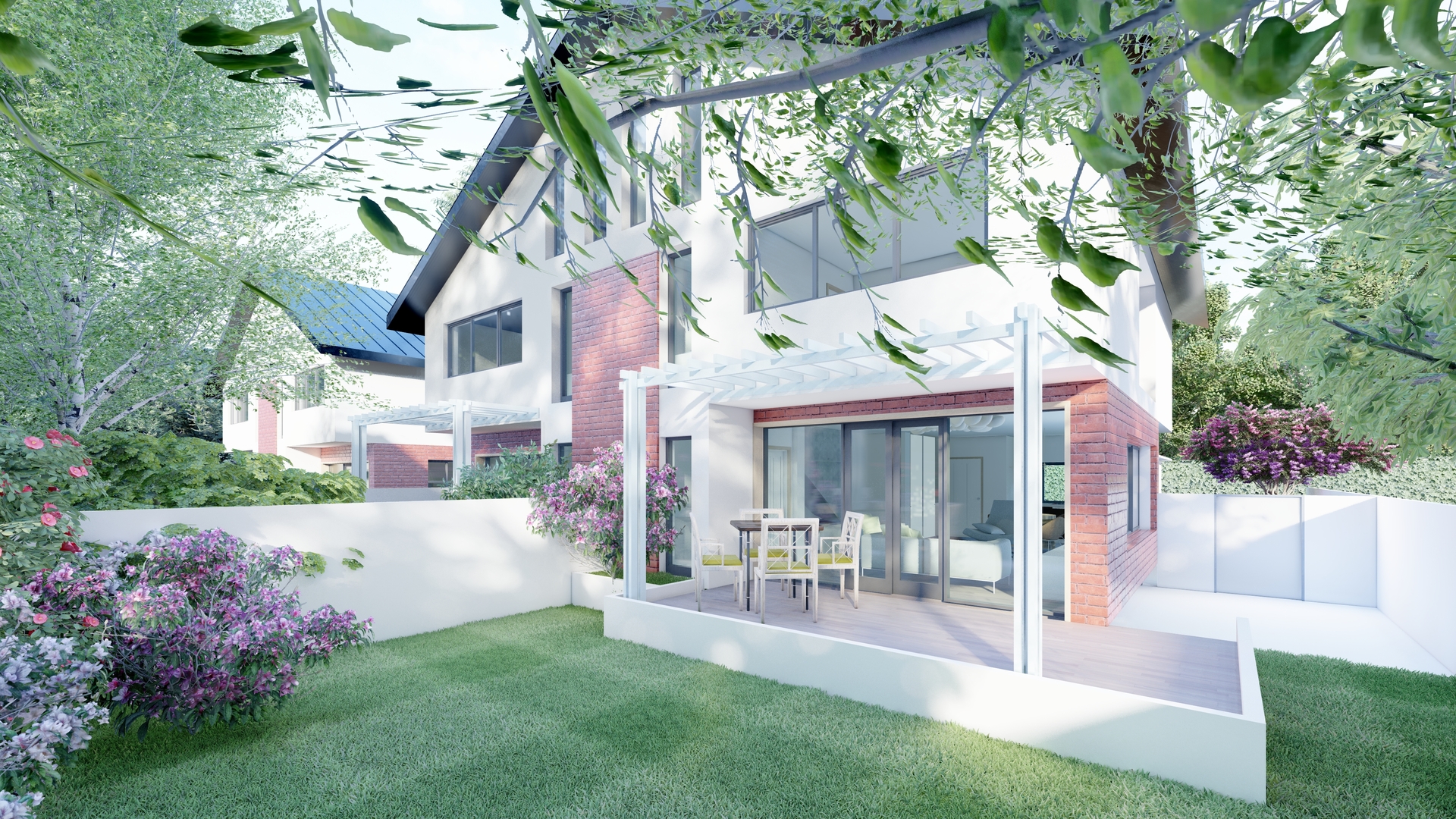 Terenul beneficiază de dublă deschidere (Nord și Vest), cu acces pietonal și auto separat. Volumetria este marcată de retrageri și aliniamente care valorifică parcelele învecinate și permit o orientare optimă a spațiilor.